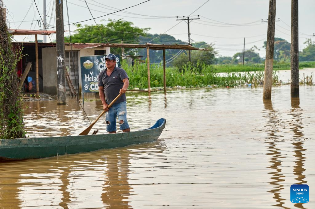 A man rows a boat in the flood in Babahoyo, Los Rios, Ecuador, March 15, 2026. According to local authorities, at least 11 people were dead in Ecuador due to the rain-triggered flood and landslides this year. (Photo by Ricardo Landeta/Xinhua)