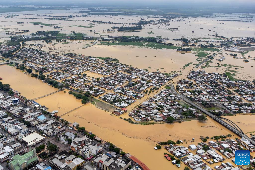 An aerial drone photo taken on March 15, 2026 shows a flood-affected area in Babahoyo, Los Rios, Ecuador. According to local authorities, at least 11 people were dead in Ecuador due to the rain-triggered flood and landslides this year. (Photo by Ricardo Landeta/Xinhua)