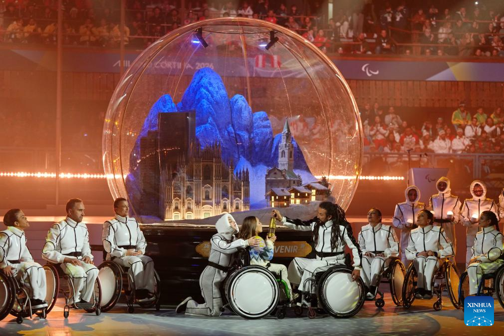 Artists perform during the closing ceremony of Milan-Cortina 2026 Paralympic Winter Games in Cortina D'ampezzo, Italy, March 15, 2026. (Xinhua/Mu Yu)