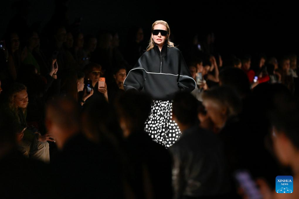 A model presents a creation during the Moscow Fashion Week in Moscow, Russia, on March 15, 2026. The Moscow Fashion Week kicked off here on March 14 and will last until March 19. (Photo by Alexander Zemlianichenko Jr/Xinhua)
