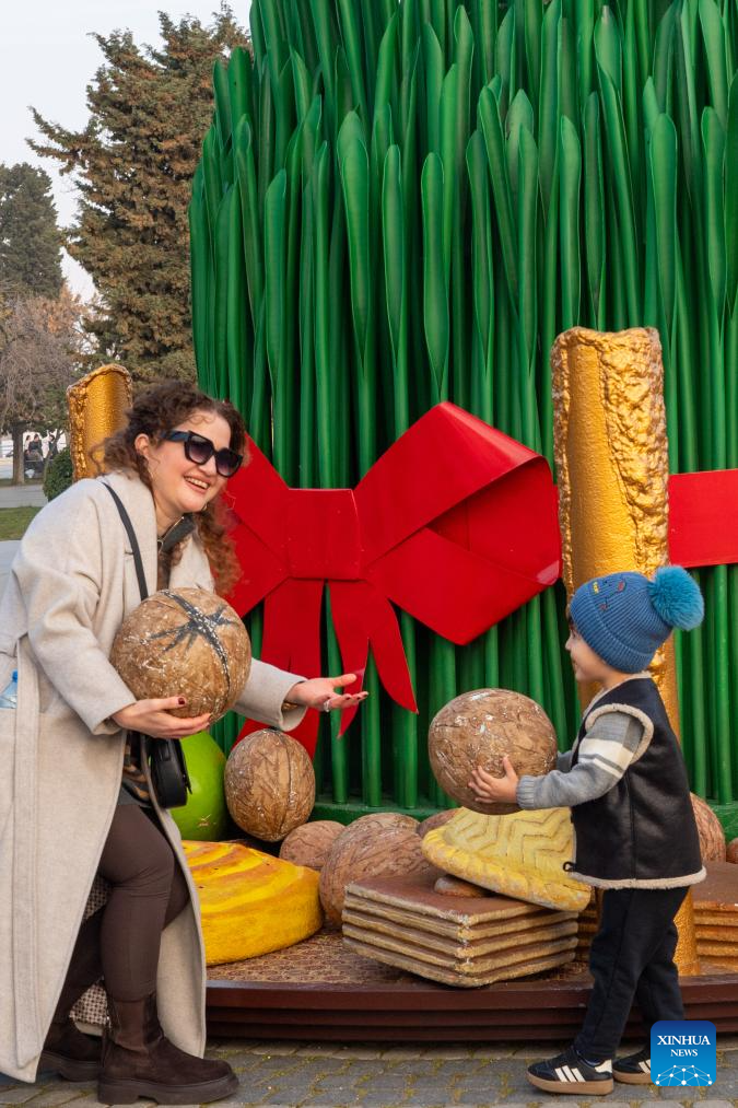 People enjoy festive decorations in a seaside park before Nowruz festival in Baku, Azerbaijan, March 16, 2026. (Xinhua/Chen Junfeng)