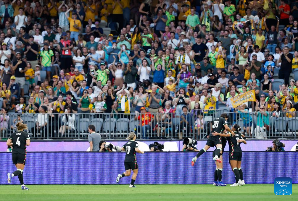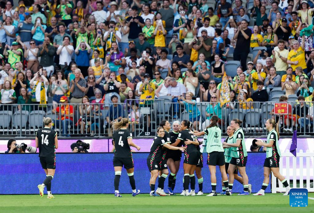 Players of Australia celebrate during the semifinal of Women's Asian Cup between China and Australia at Perth Stadium in Perth, Australia, March 17, 2026. (Xinhua/Ma Ping)