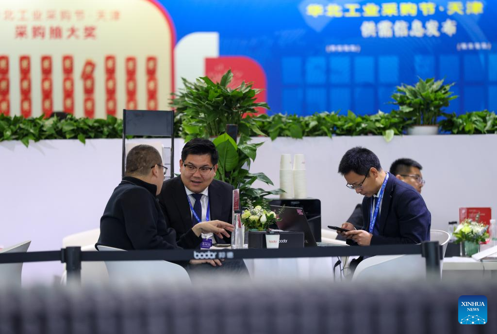 People talk at the 22nd China (Tianjin) International Equipment & Manufacturing Industry Expo (CIEX) in north China's Tianjin, March 18, 2026. The four-day expo kicked off here on Wednesday, attracting over 800 enterprises from home and abroad to participate. (Xinhua/Sun Fanyue)