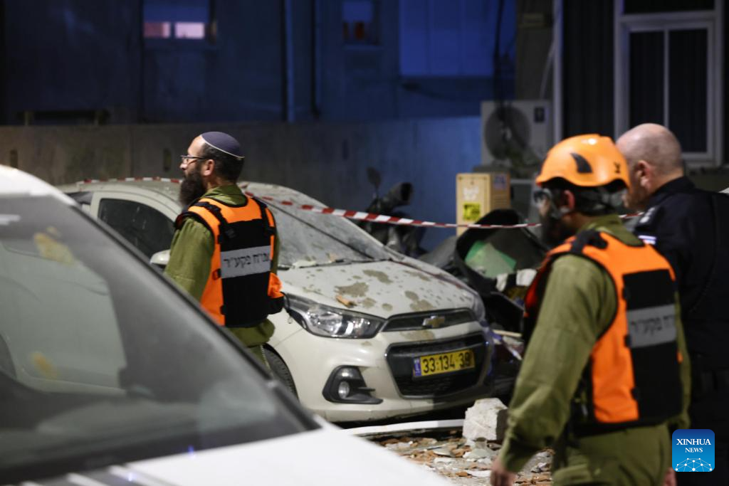 Emergency responders work at an impact site of an Iranian missile attack in Ramat Gan, central Israel, March 18, 2026. A man and a woman were killed Tuesday night in the city of Ramat Gan, central Israel, after a missile fired from Iran hit a residential building, Israel's national emergency service MDA reported. (Photo by Jamal Awad/Xinhua)