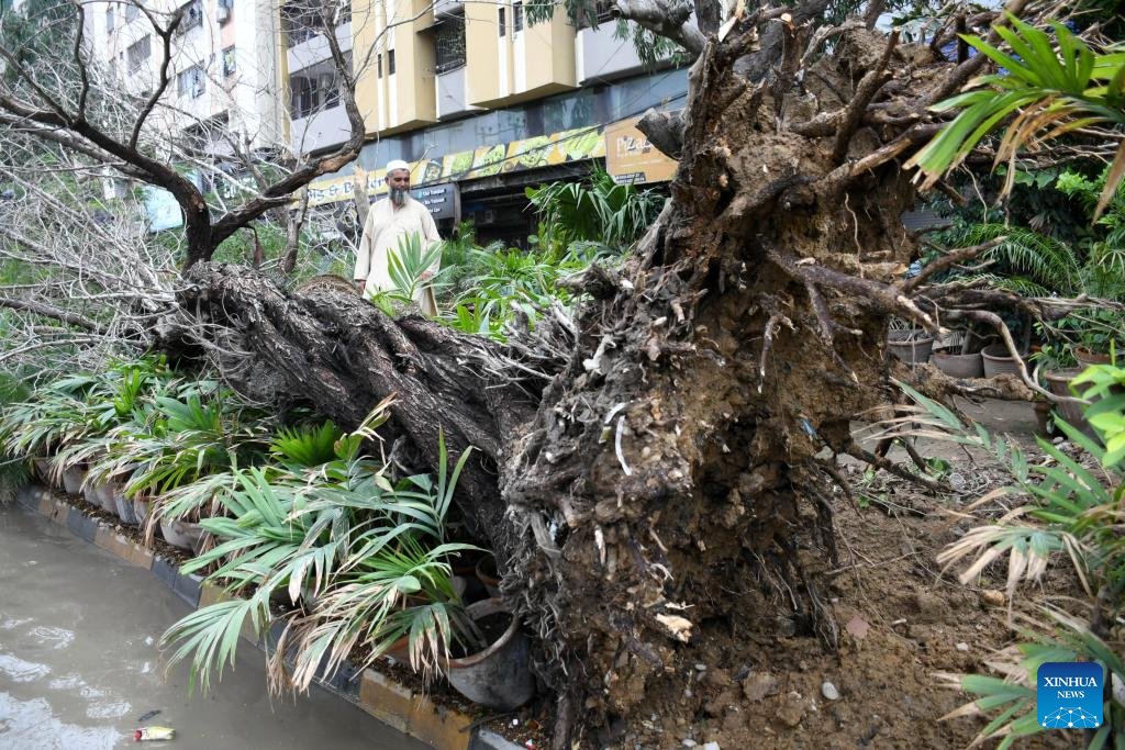 A man examines a fallen tree after heavy rain in Karachi, Pakistan on March 19, 2026. At least 17 people were killed and 30 others injured in rain-related incidents in Pakistan's southern port city of Karachi on Wednesday, officials said. (Str/Xinhua)