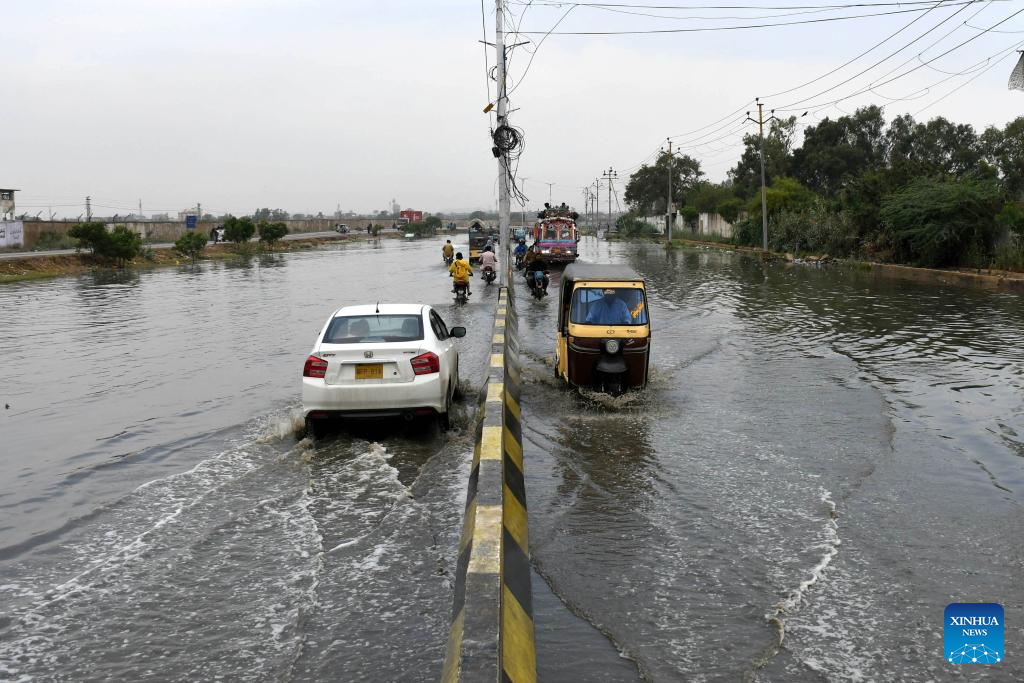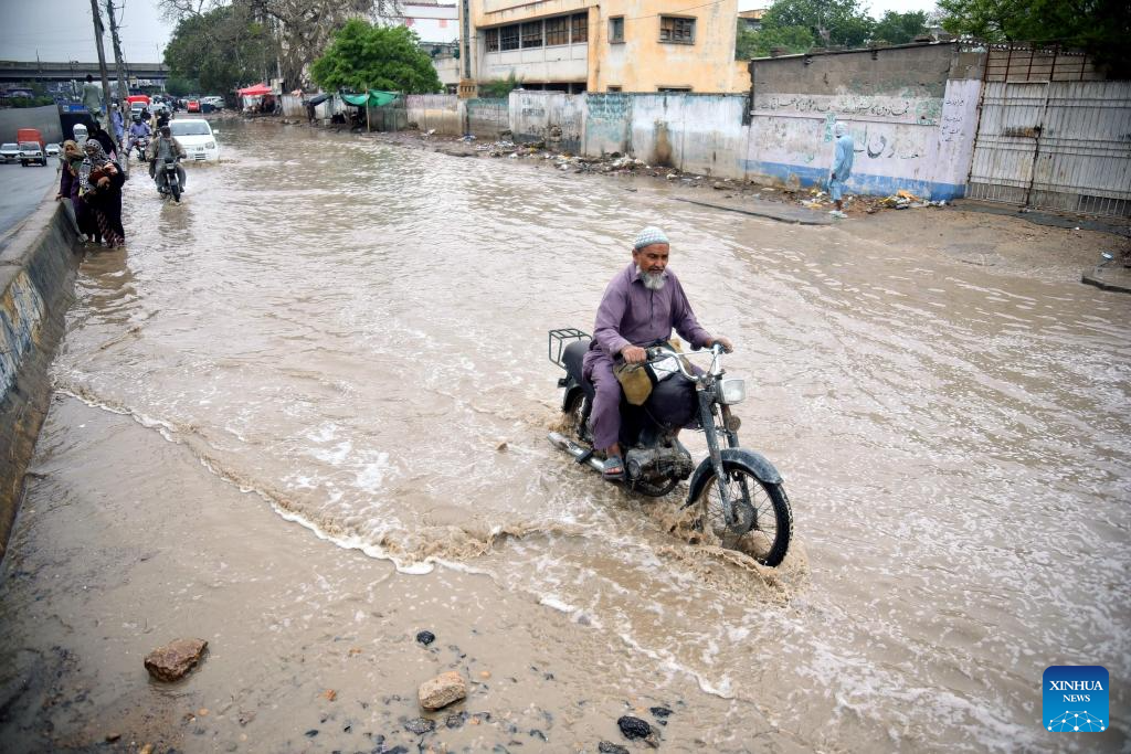 People travel on a flooded road after heavy rain in Karachi, Pakistan on March 19, 2026. At least 17 people were killed and 30 others injured in rain-related incidents in Pakistan's southern port city of Karachi on Wednesday, officials said. (Str/Xinhua)