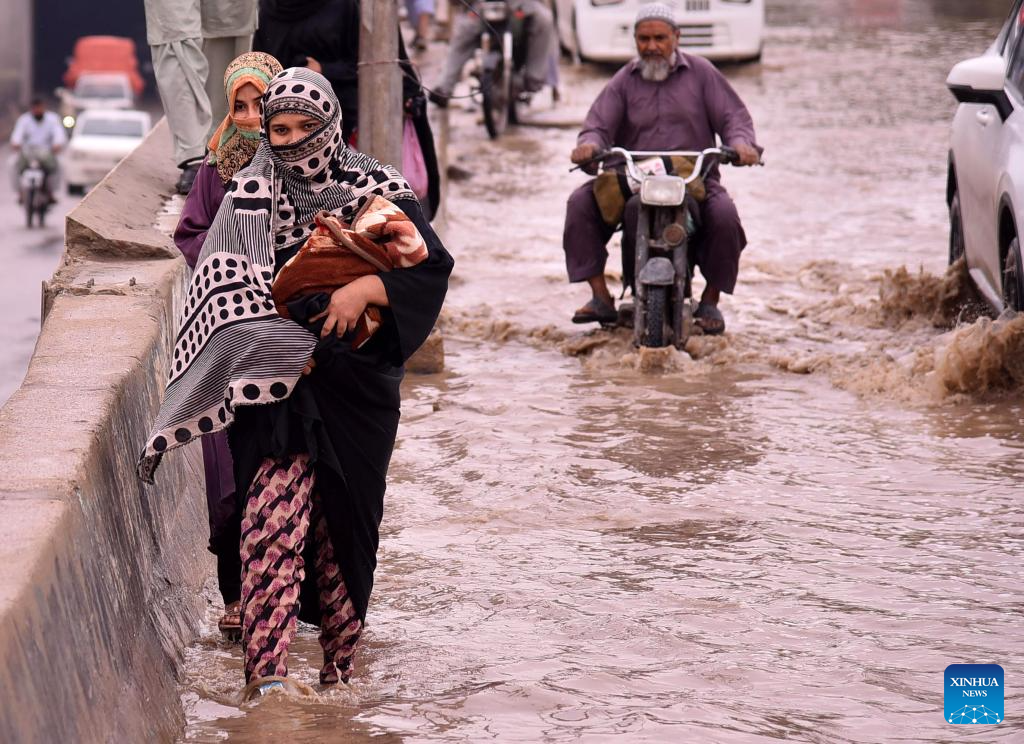 People wade through rain water after heavy rain in Karachi, Pakistan on March 19, 2026. At least 17 people were killed and 30 others injured in rain-related incidents in Pakistan's southern port city of Karachi on Wednesday, officials said. (Str/Xinhua)