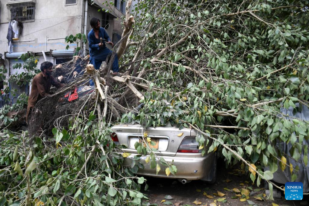 Workers cut a fallen tree on a vehicle after heavy rain in Karachi, Pakistan on March 19, 2026. At least 17 people were killed and 30 others injured in rain-related incidents in Pakistan's southern port city of Karachi on Wednesday, officials said. (Str/Xinhua)