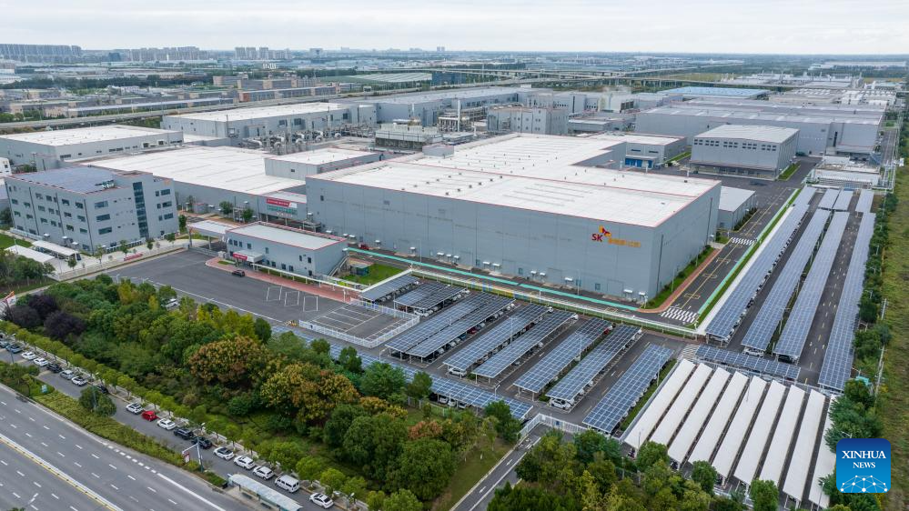 This aerial drone photo shows a view of a new energy battery production base of South Korean EV battery maker SK On Jiangsu Co,. Ltd. in Yancheng, east China's Jiangsu Province, Oct. 16, 2025. (Xinhua/Li Bo)