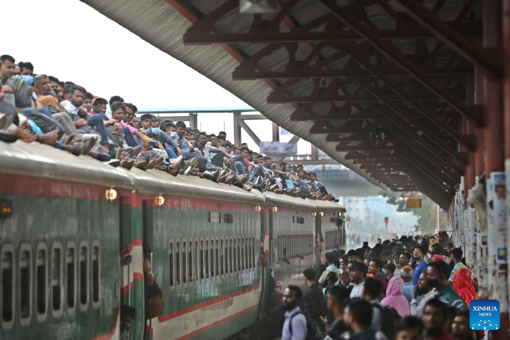 People take a train for returning home at Tongi Railway Station in Gazipur, Bangladesh, March 18, 2026. The station here is packed with huge number of home-bound passengers as the Eid al-Fitr is drawing near. (Photo by Habibur Rahman/Xinhua)
