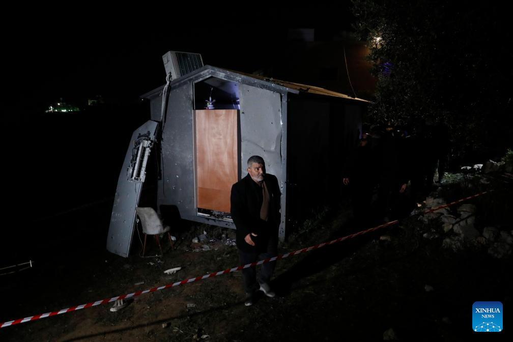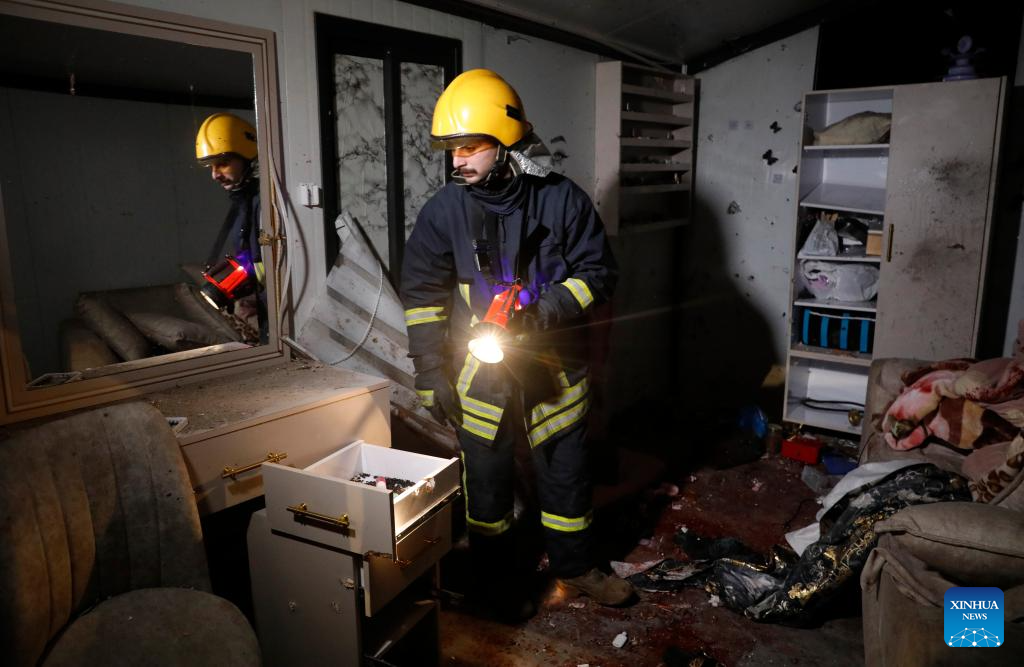 A Palestinian Civil Defense worker inspects the site where shrapnel fell in the town of Beit Awwa, southwest of Hebron in the West Bank, on March 18, 2026. Four Palestinians were killed and six others injured on Wednesday evening by falling shrapnel in the southern West Bank, the Palestinian news agency WAFA reported. (Photo by Mamoun Wazwaz/Xinhua)