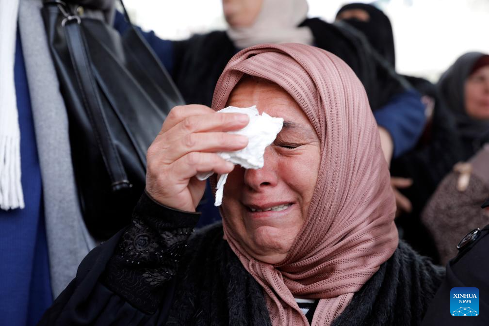 A Palestinian mourns at the funeral of the killed victims after shrapnel fell in the town of Beit Awwa, southwest of Hebron in the West Bank, on March 19, 2026. Four Palestinians were killed and six others injured on Wednesday evening by falling shrapnel in the southern West Bank, the Palestinian news agency WAFA reported.(Photo by Mamoun Wazwaz/Xinhua)