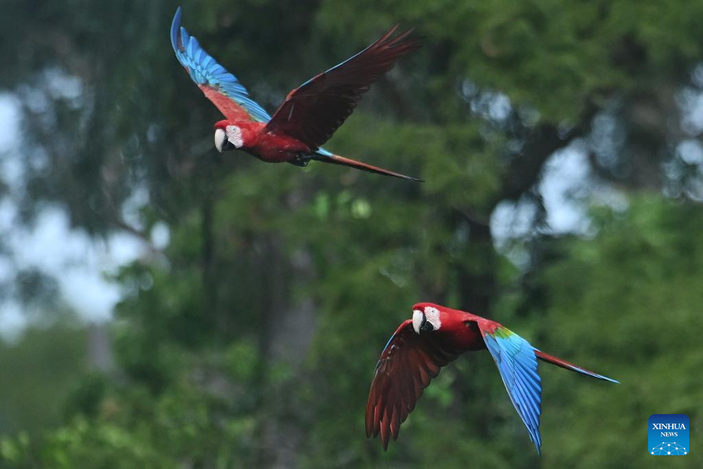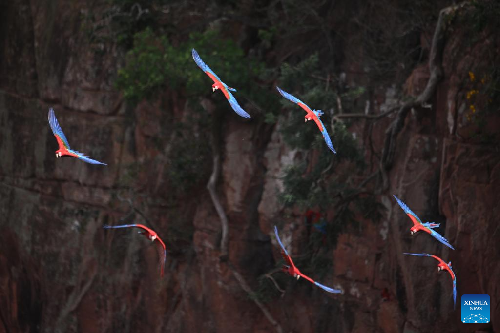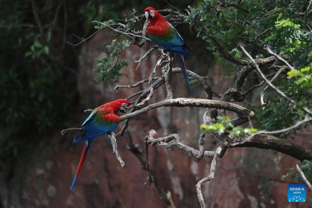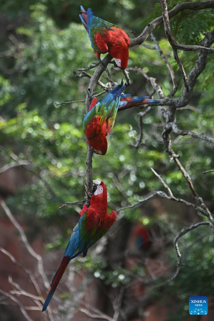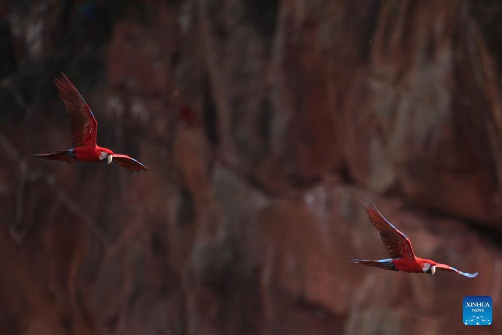 Red-and-green macaws are seen at the Macaw's Sinkhole in Jardim, Mato Grosso do Sul, Brazil, March 19, 2026. (Photo by Lucio Tavora/Xinhua)