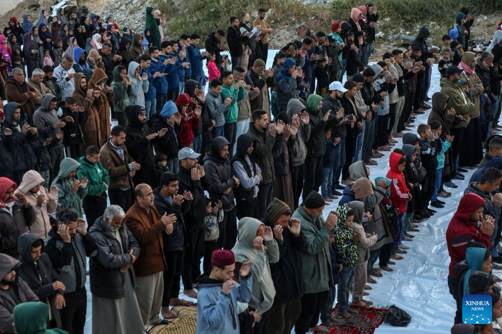 Palestinians perform Eid al-Fitr prayers amid the rubble of destroyed buildings in the Tel al-Hawa neighborhood, southwest of Gaza City, March 20, 2026. (Photo by Rizek Abdeljawad/Xinhua)