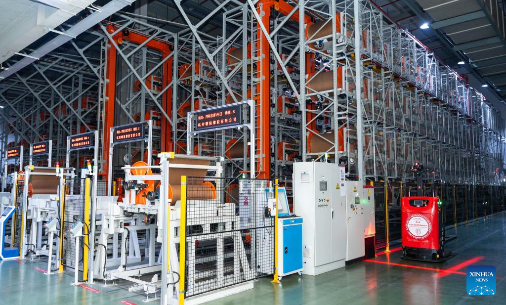 An undated file photo shows an AGV (Automated Guided Vehicle) transporting materials at a warehouse of Zhongce Rubber Group in Hangzhou, east China's Zhejiang Province. (Xinhua)