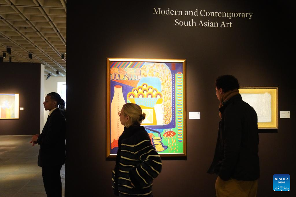 People visit a South Asian art exhibition at the Sotheby's auction house in New York, the United States, on March 19, 2026. Asia Week New York 2026 opened in New York City on Thursday, showcasing Asian art works from museums, galleries and auction houses. (Xinhua/Zhang Fengguo)