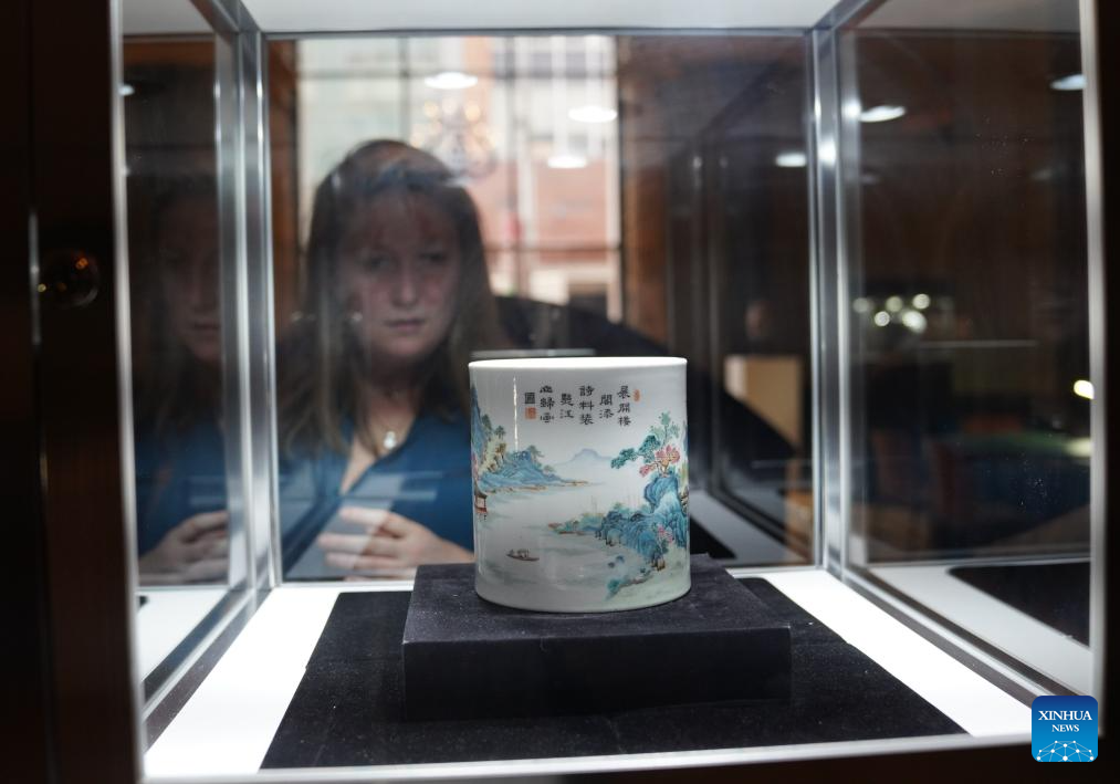 A visitor looks at a Chinese porcelain work at the Bonhams auction house in New York, the United States, on March 19, 2026. Asia Week New York 2026 opened in New York City on Thursday, showcasing Asian art works from museums, galleries and auction houses. (Xinhua/Zhang Fengguo)