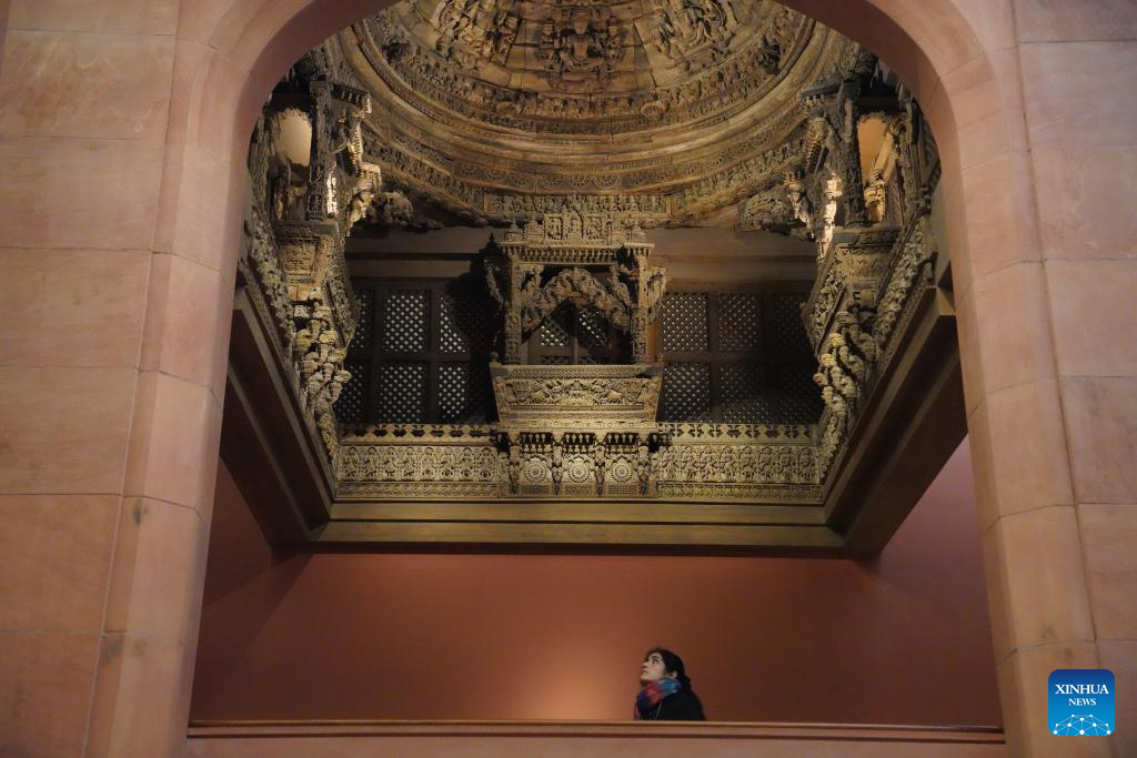 A woman looks at a wood-made structure at the Metropolitan Museum of Art in New York, the United States, on March 19, 2026. Asia Week New York 2026 opened in New York City on Thursday, showcasing Asian art works from museums, galleries and auction houses. (Xinhua/Zhang Fengguo)