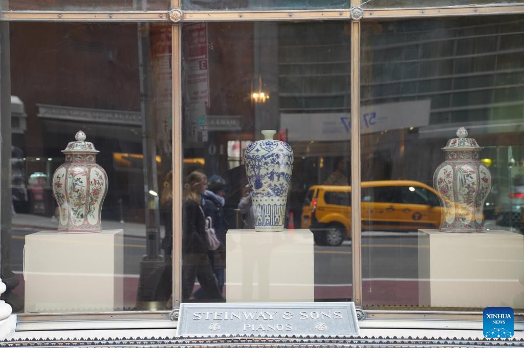 People and vehicles are reflected on a window of an auction house with Chinese porcelain works in New York, the United States, on March 19, 2026. Asia Week New York 2026 opened in New York City on Thursday, showcasing Asian art works from museums, galleries and auction houses. (Xinhua/Zhang Fengguo)