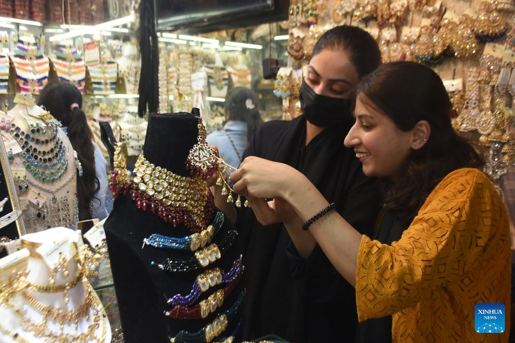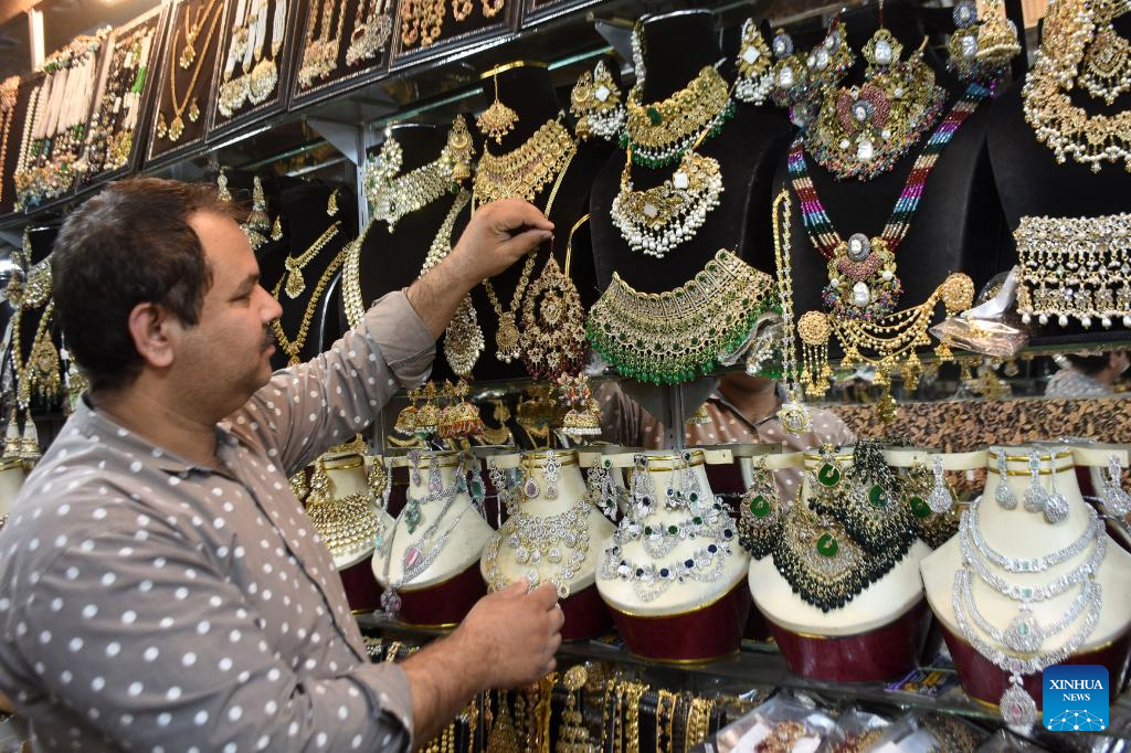 A shopkeeper displays jewelry ahead of Eid al-Fitr, which marks the end of Ramadan, in Lahore, Pakistan, on March 19, 2026. (Photo by Sajjad/Xinhua)