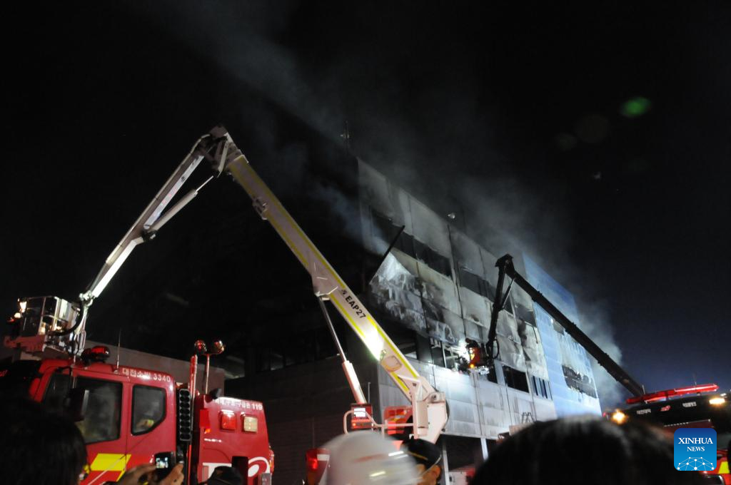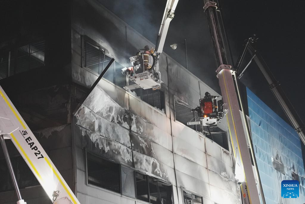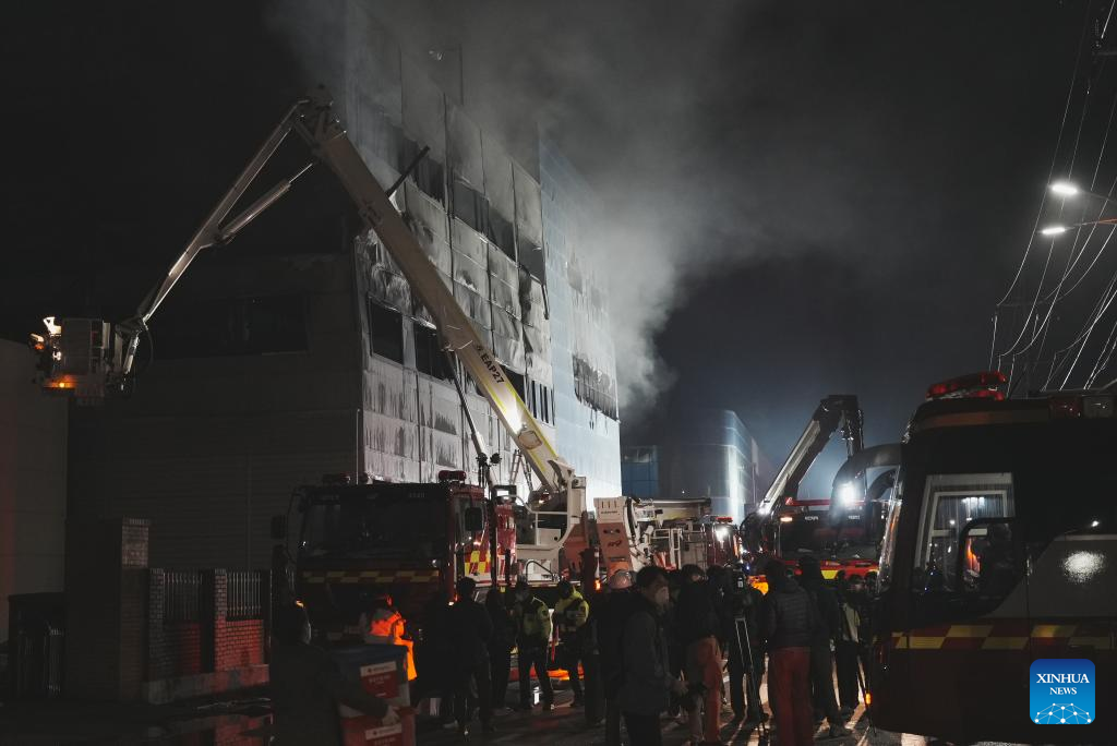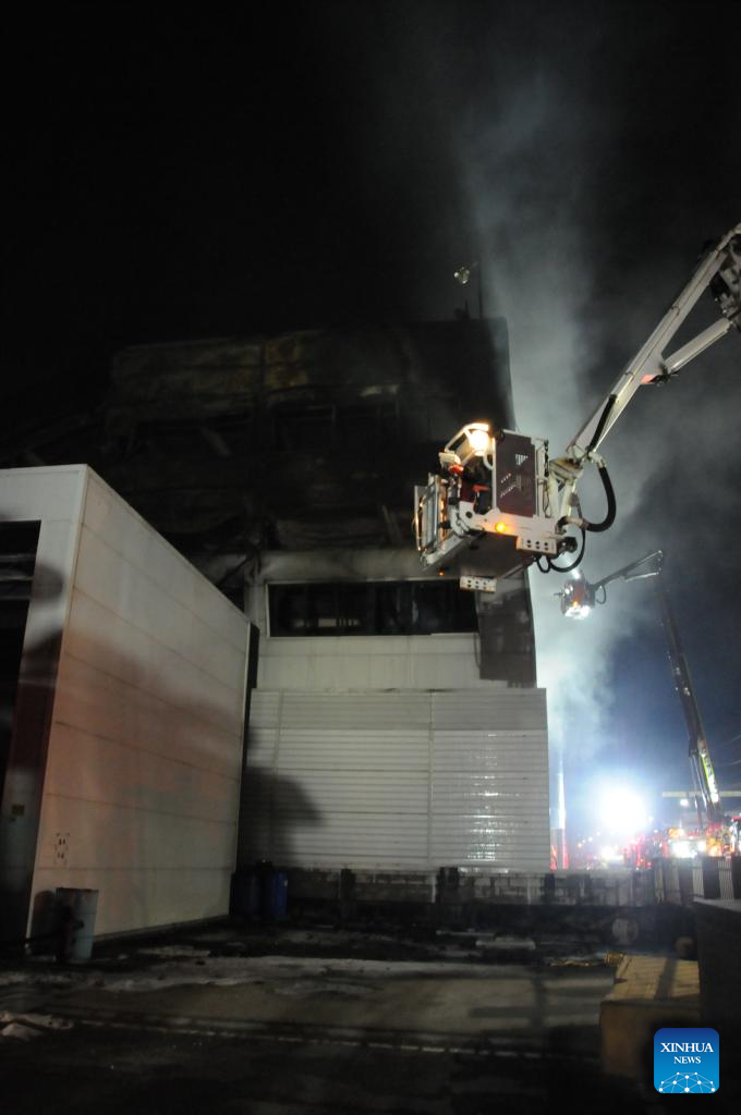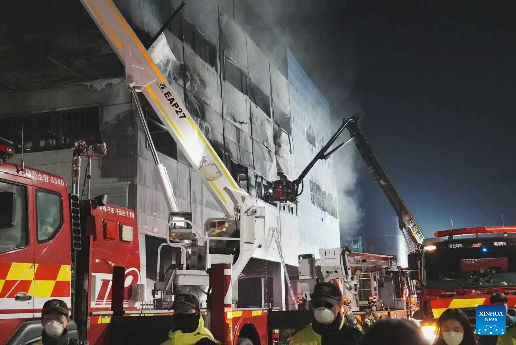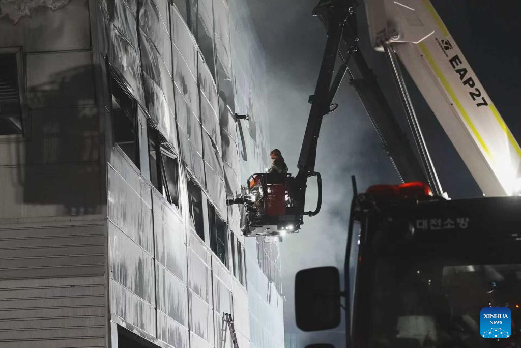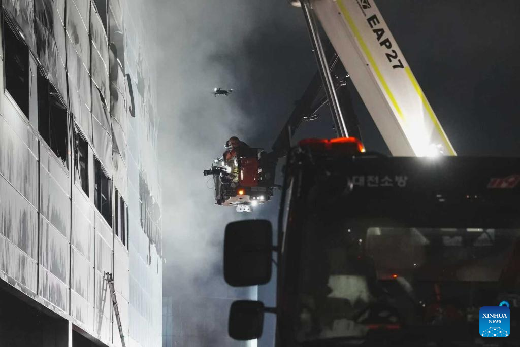 Rescuers work at the site of a fire that broke out at an automotive parts manufacturing factory in Daejeon, South Korea, on March 20, 2026. A large-scale fire broke out on Friday in South Korea's automotive parts manufacturing factory, leaving 53 injured and 14 others missing, according to Yonhap news agency. (Xinhua/Zhang Can)