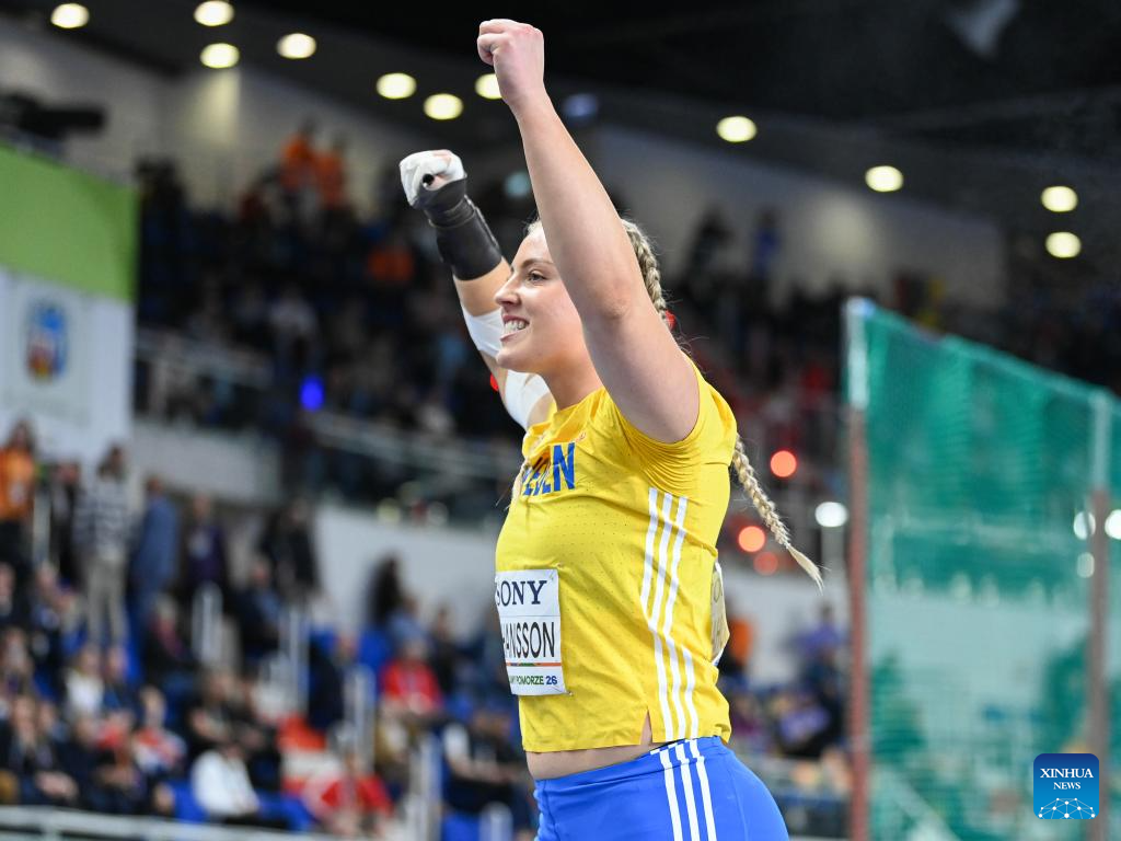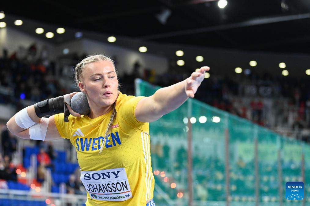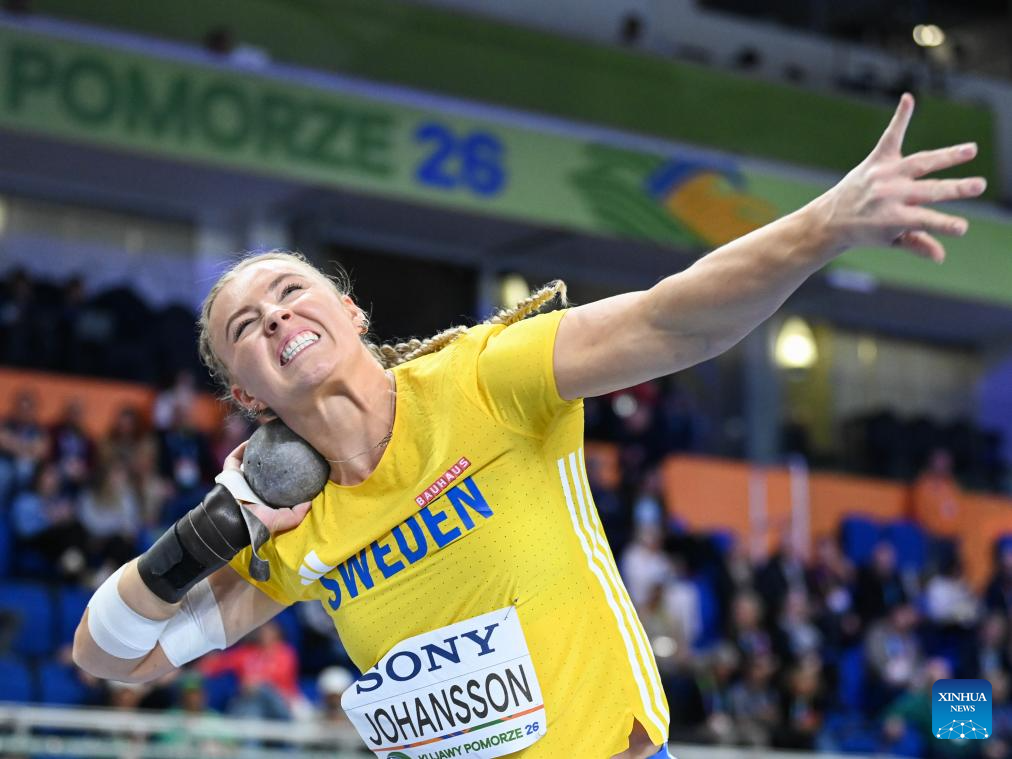 Axelina Johansson of Sweden competes during the women's shot put final at the 2026 World Athletics Indoor Championships in Torun, Poland, March 20, 2026. (Xinhua/Zhang Haofu)