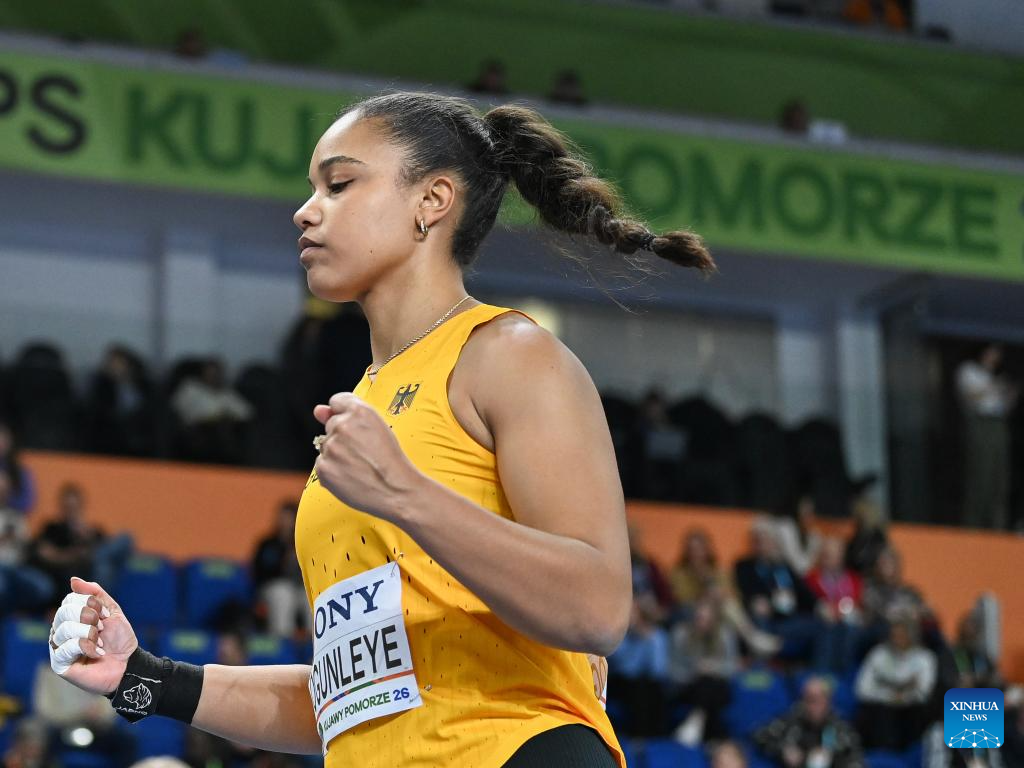 Yemisi Ogunleye of Germany reacts during the women's shot put final at the 2026 World Athletics Indoor Championships in Torun, Poland, March 20, 2026. (Xinhua/Zhang Haofu)