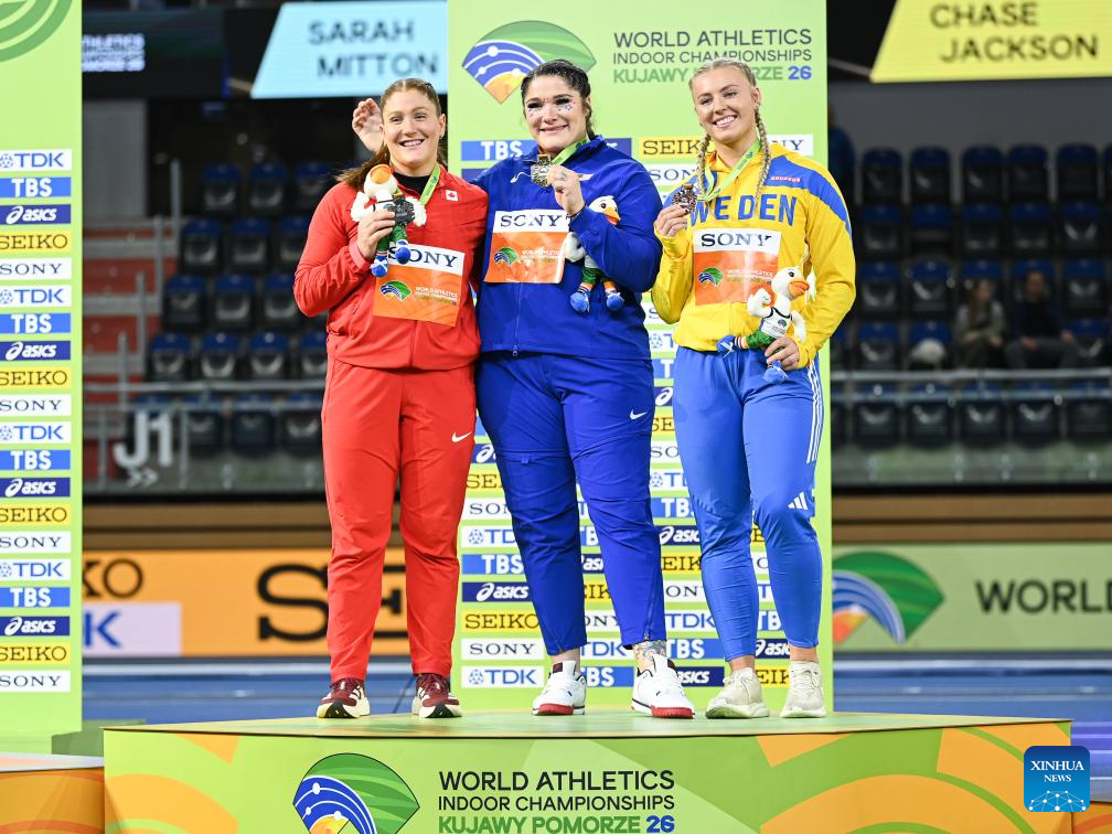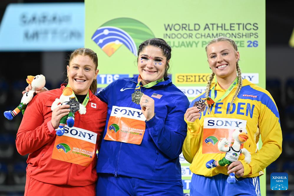 Gold medalist Chase Jackson (C) of the United States, silver medalist Sarah Mitton (L) of Canada and bronze medalist Axelina Johansson of Sweden pose for photograph during the awarding ceremony of the women's shot put final at the 2026 World Athletics Indoor Championships in Torun, Poland, March 20, 2026. (Xinhua/Zhang Haofu)