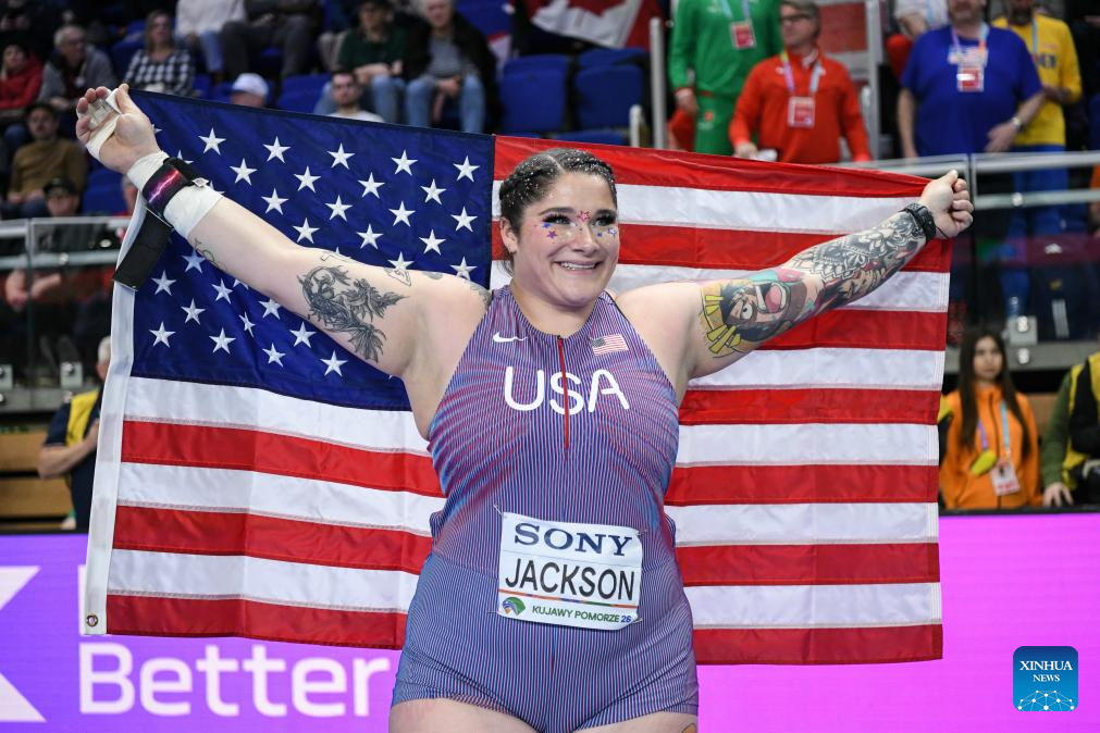 Chase Jackson of the United States celebrates after winning the women's shot put final at the 2026 World Athletics Indoor Championships in Torun, Poland, March 20, 2026. (Xinhua/Zhang Haofu)