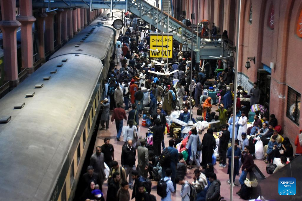 People board a train bound for their hometowns on the eve of Eid al-Fitr festival in Lahore, Pakistan on March 20, 2026. (Photo by Sajjad/Xinhua)