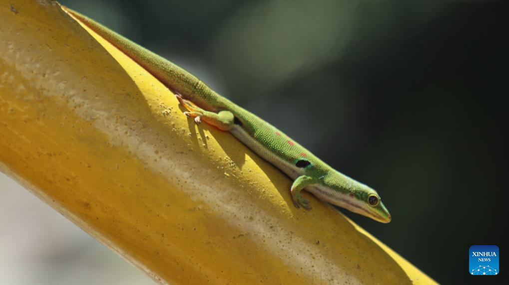This photo taken on March 19, 2026 shows a day gecko at Ranomafana National Park in Fianarantsoa Province, Madagascar. The Ranomafana National Park is part of the Rainforests of the Atsinanana (Madagascar), which was inscribed on UNESCO World Heritage List in 2007. In Malagasy, "Ranomafana" means "hot water", reflecting the area's abundant geothermal resources. The park features well-preserved tropical rainforest, notable biodiversity, and a wide range of endemic flora and fauna. (Xinhua/Chen Shaohua)