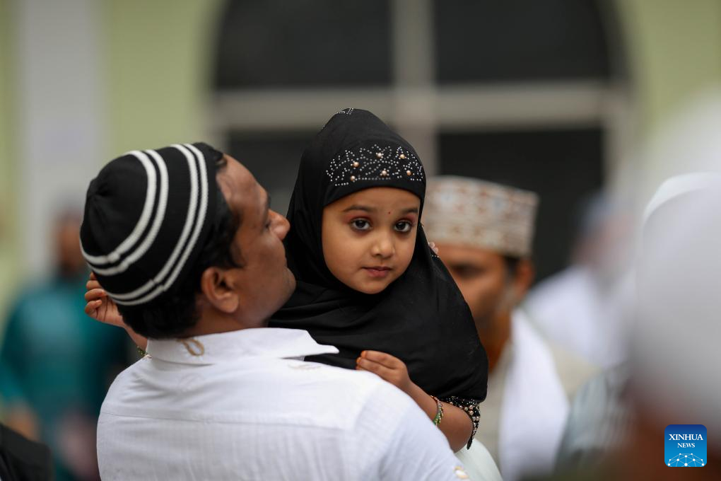 A devotee and a child are seen during Eid al-Fitr prayers at a mosque in Kathmandu, Nepal, March 21, 2026. (Photo by Sulav Shrestha/Xinhua)