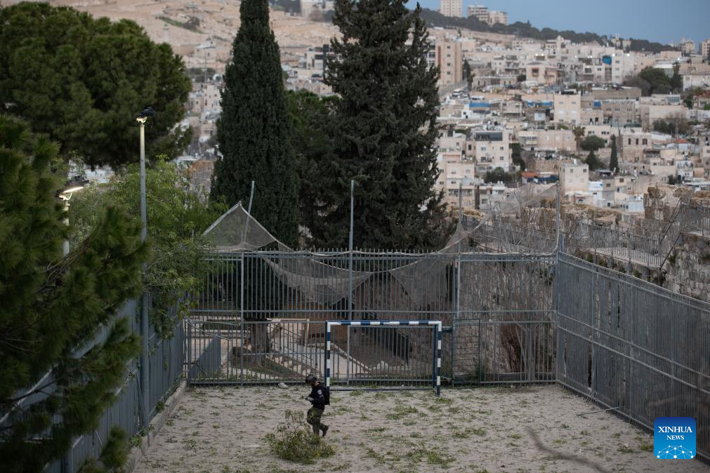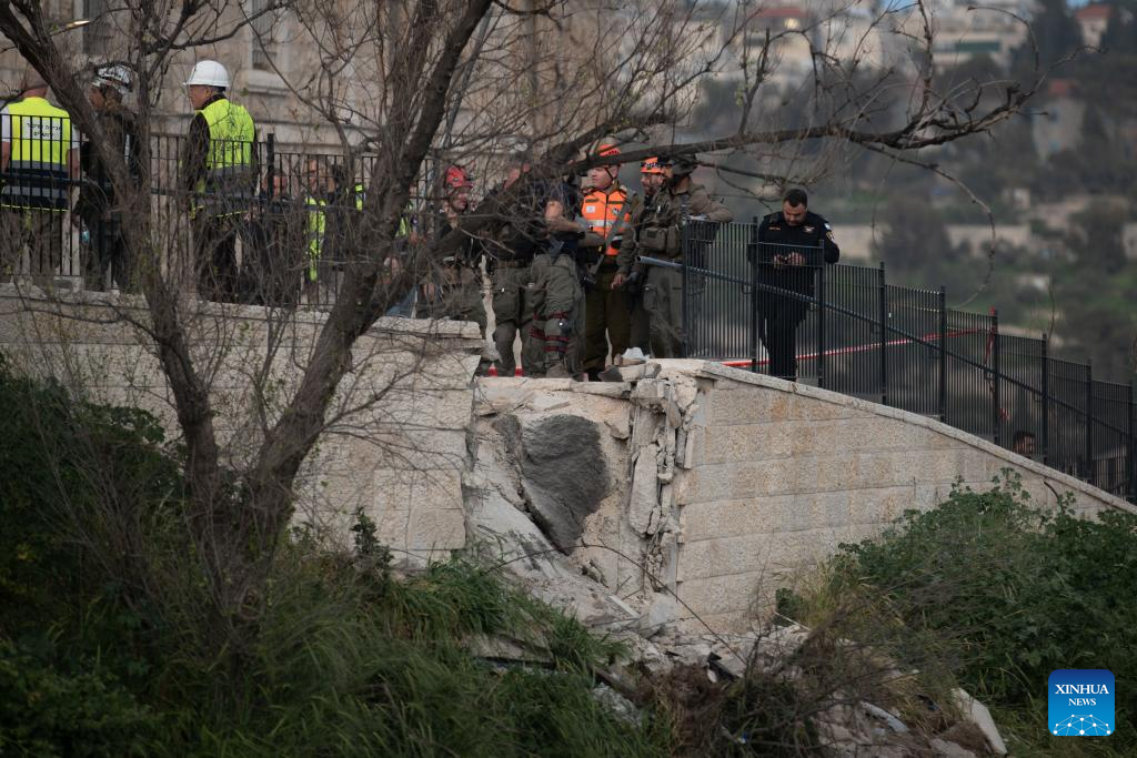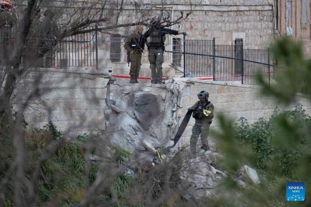 Emergency responders work at a site affected by missile debris near the Old City of Jerusalem, March 20, 2026. (Xinhua/Chen Junqing)
