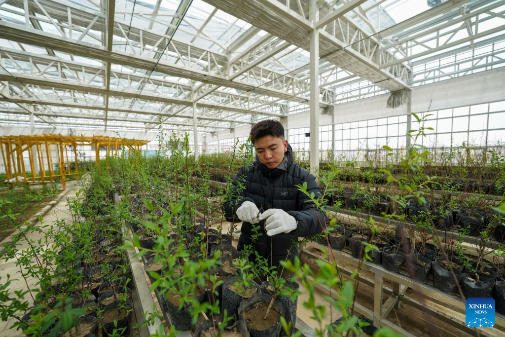 A staff member of the forestry and grassland bureau of Nagqu prunes saplings at a seedling base in Nagqu, southwest China's Xizang Autonomous Region, April 25, 2025. (Xinhua/Jigme Dorje)