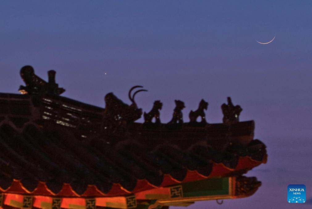 This drone photo taken on March 20, 2026 shows the planet of Venus next to the moon in the twilight sky over Fujin City, northeast China's Heilongjiang Province. (Photo by Geng Xiqing/Xinhua)