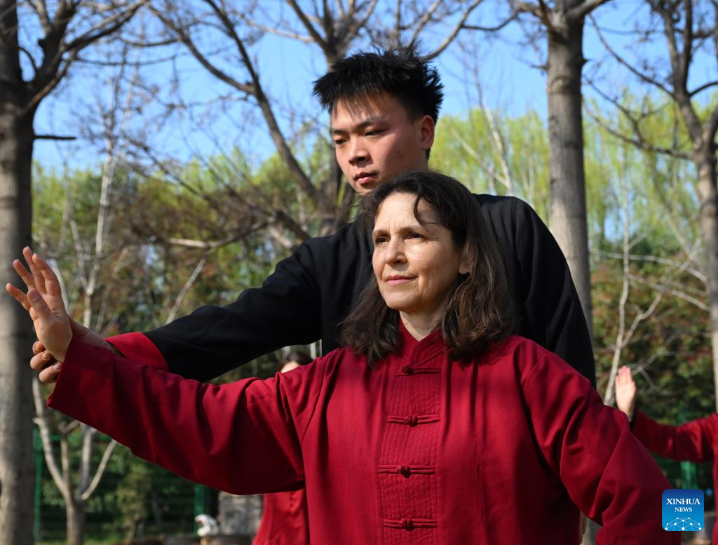 Bulgarian practitioner Liana Simeonova (front) practices Taijiquan in Chenjiagou Village of Wenxian County, central China's Henan Province, March 20, 2026.