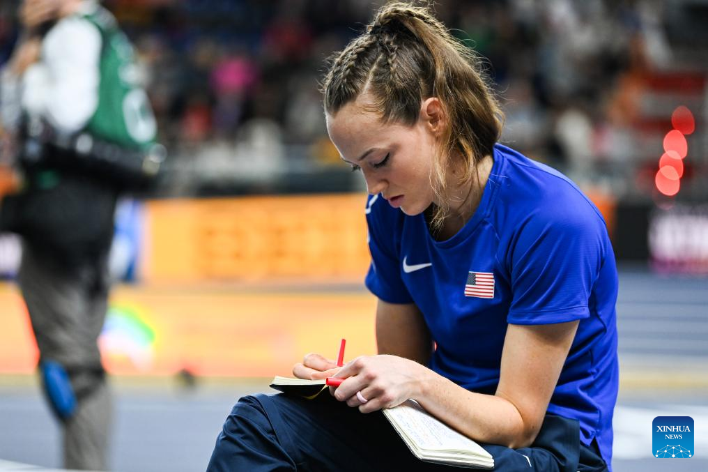 Charity Hufnagel of the United States take notes during the women's high jump final at the 2026 World Athletics Indoor Championships in Torun, Poland, March 20, 2026. (Xinhua/Zhang Haofu)