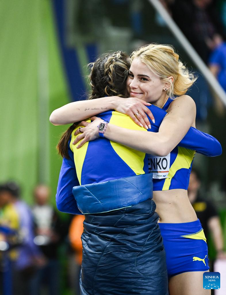 Yuliia Levchenko (R) and Yaroslava Mahuchikh of Ukraine celebrate during the women's high jump final at the 2026 World Athletics Indoor Championships in Torun, Poland, March 20, 2026. (Xinhua/Zhang Haofu)