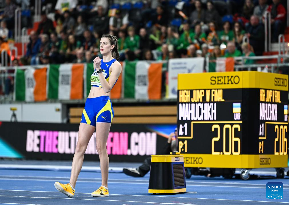 Yaroslava Mahuchikh of Ukraine competes during the women's high jump final at the 2026 World Athletics Indoor Championships in Torun, Poland, March 20, 2026. (Xinhua/Zhang Haofu)