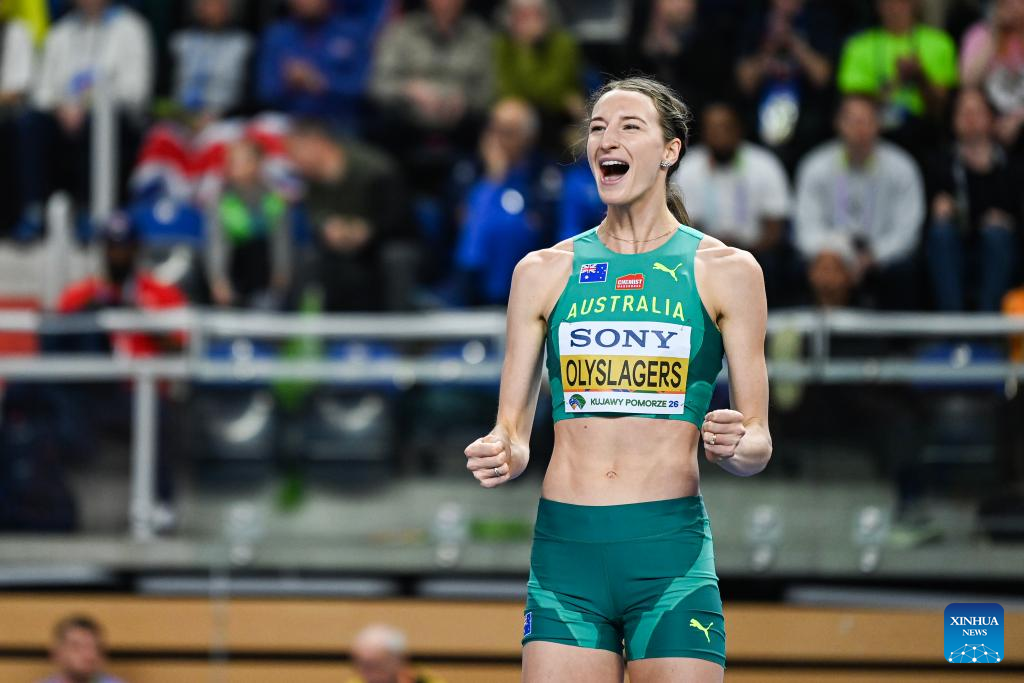 Nicola Olyslagers of Australia celebrates during the women's high jump final at the 2026 World Athletics Indoor Championships in Torun, Poland, March 20, 2026. (Xinhua/Zhang Haofu)