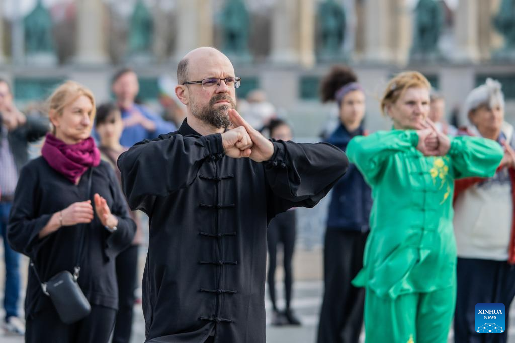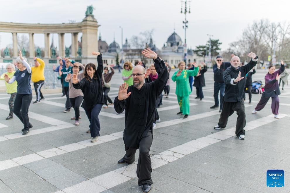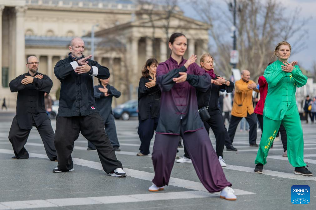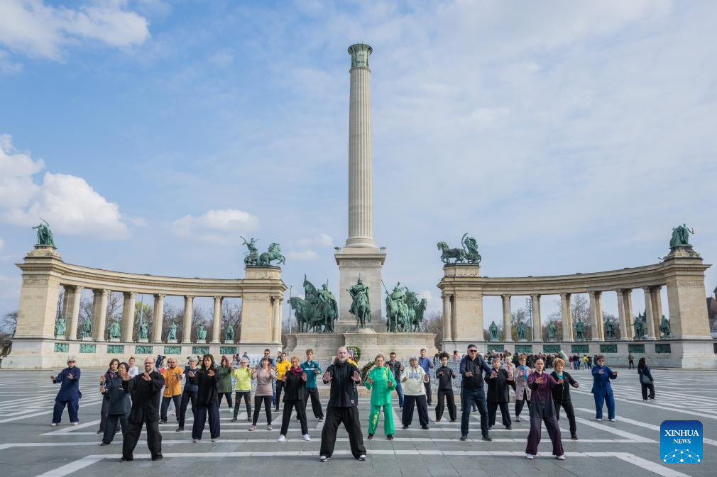 Taijiquan enthusiasts perform during the celebration event in Budapest, Hungary, on March 21, 2026. A celebration of the first International Day of Taijiquan, organized by the Hungarian Wushu Federation, was held here on Saturday at Heroes' Square. (Photo by Marton Koncz/Xinhua)