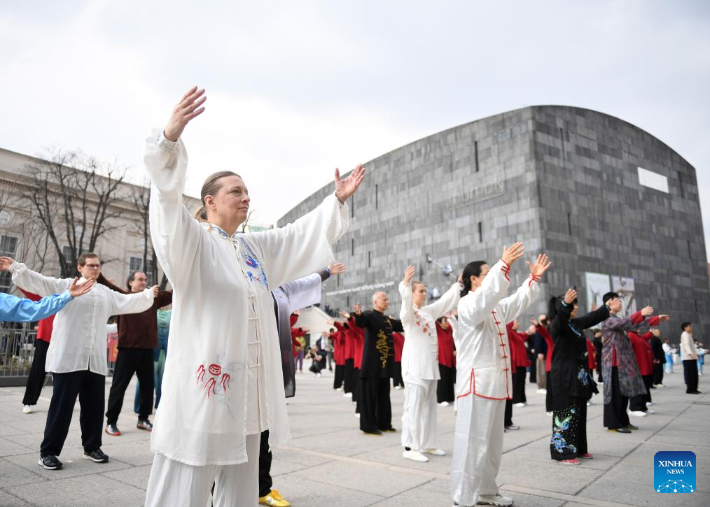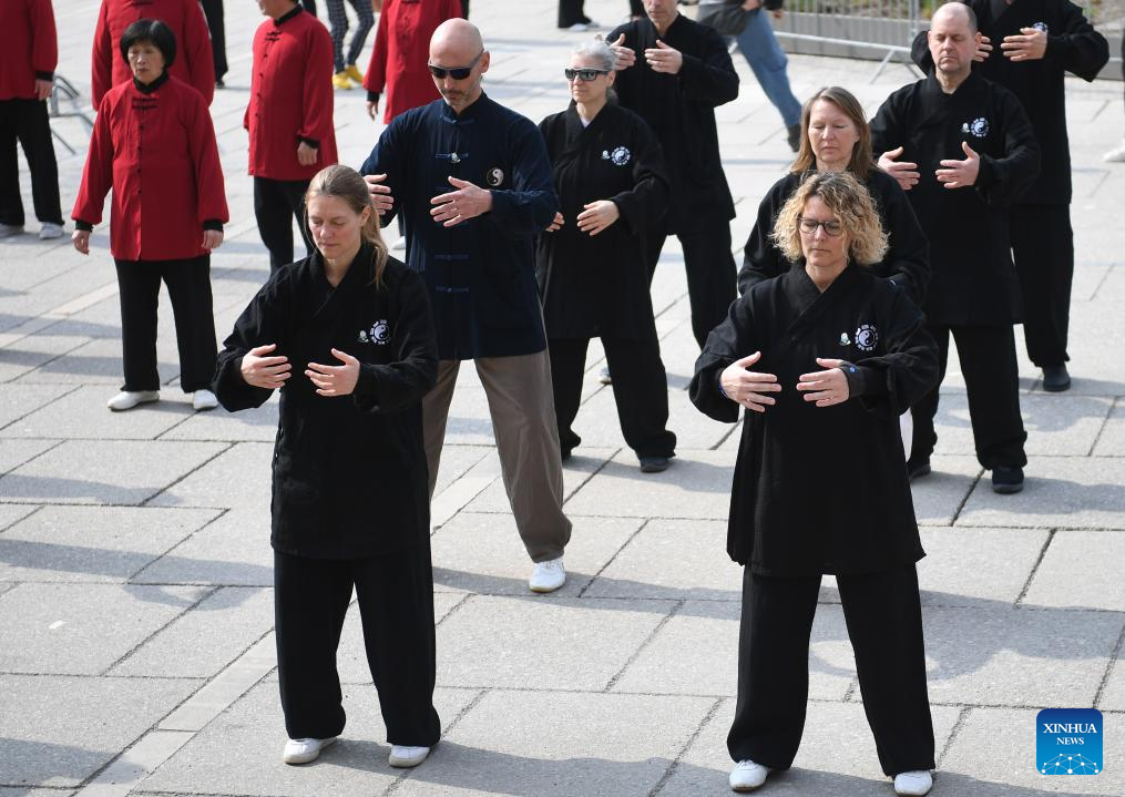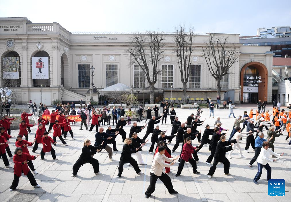 Enthusiasts perform Taijiquan, a kind of Chinese traditional martial arts, in Vienna, Austria, March 21, 2026. A celebration of the first International Taijiquan Day was held here on Saturday. (Xinhua/He Canling)