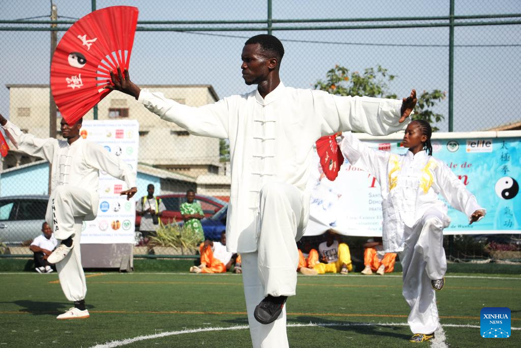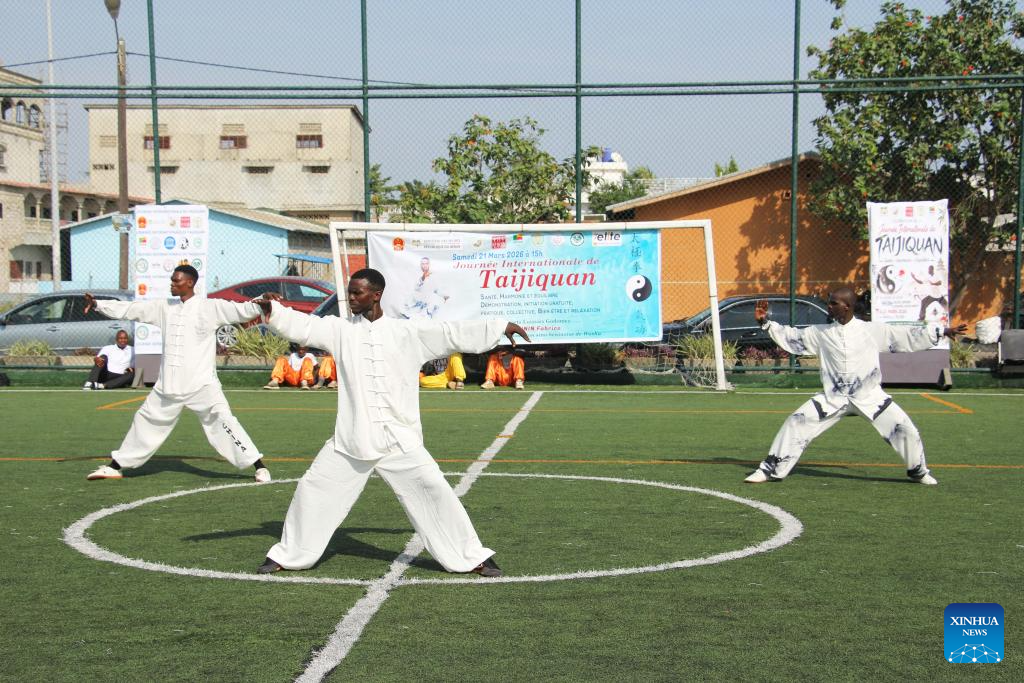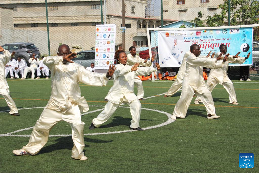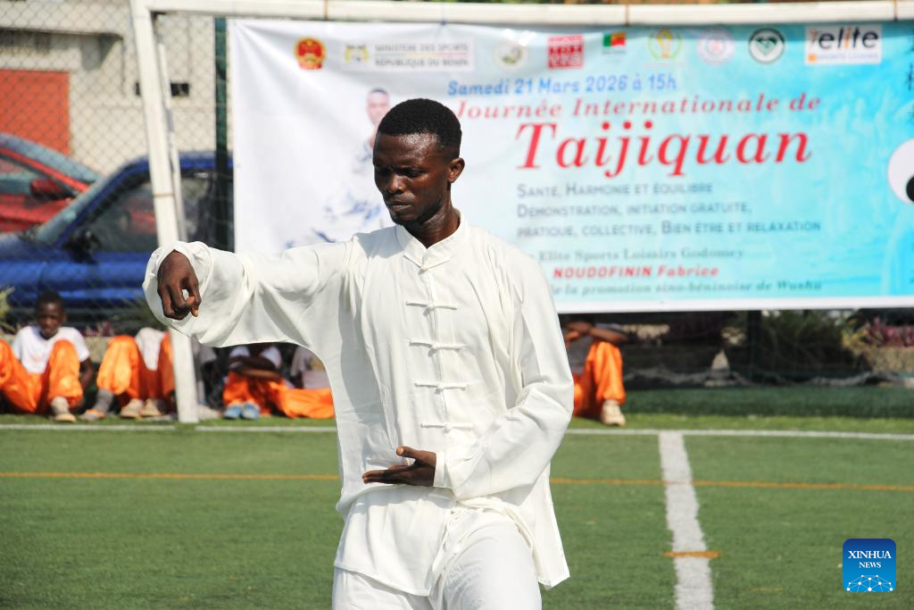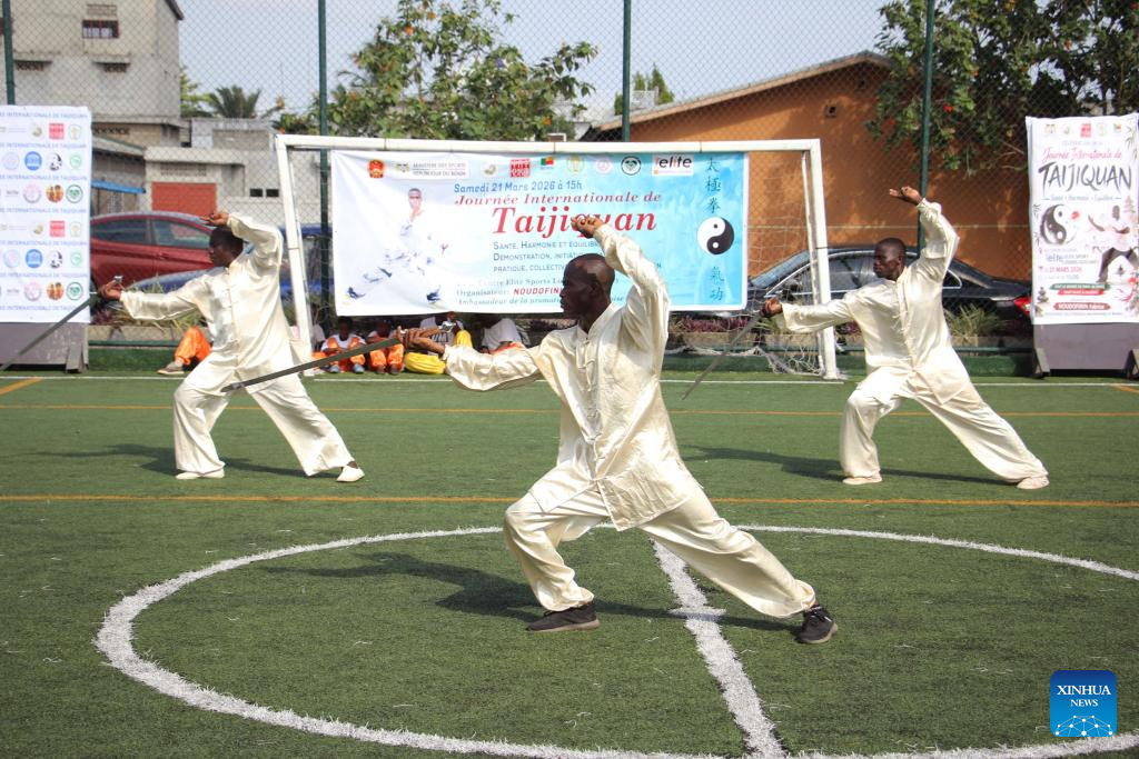 Enthusiasts perform Taijiquan, a kind of Chinese traditional martial arts, in Godomey, Benin, March 21, 2026. Demonstrations and initiation activities were held here on Saturday to celebrate the first International Taijiquan Day. (Photo by Seraphin Zounyekpe/Xinhua)