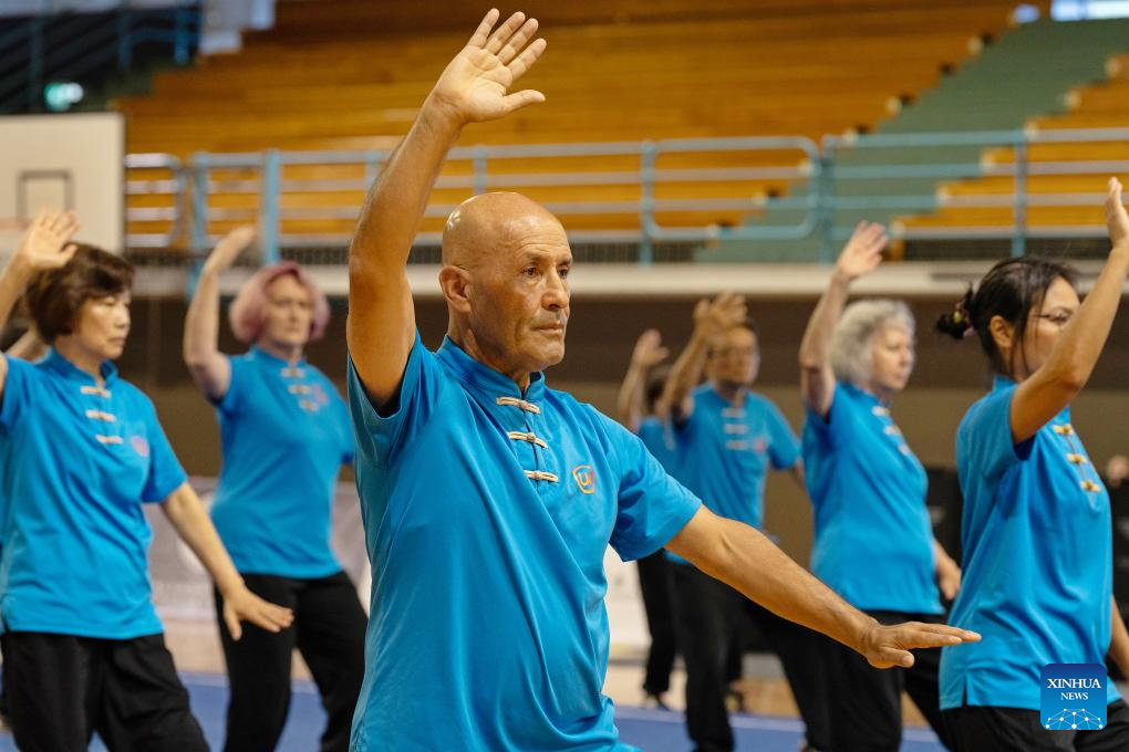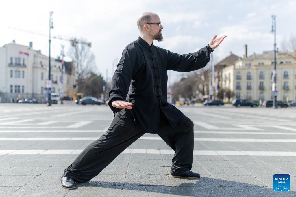 Lajos Toth, a Taijiquan enthusiast, poses for a photo during the celebration event in Budapest, Hungary, on March 21, 2026. A celebration of the first International Day of Taijiquan, organized by the Hungarian Wushu Federation, was held here on Saturday at Heroes' Square. (Photo by Marton Koncz/Xinhua)