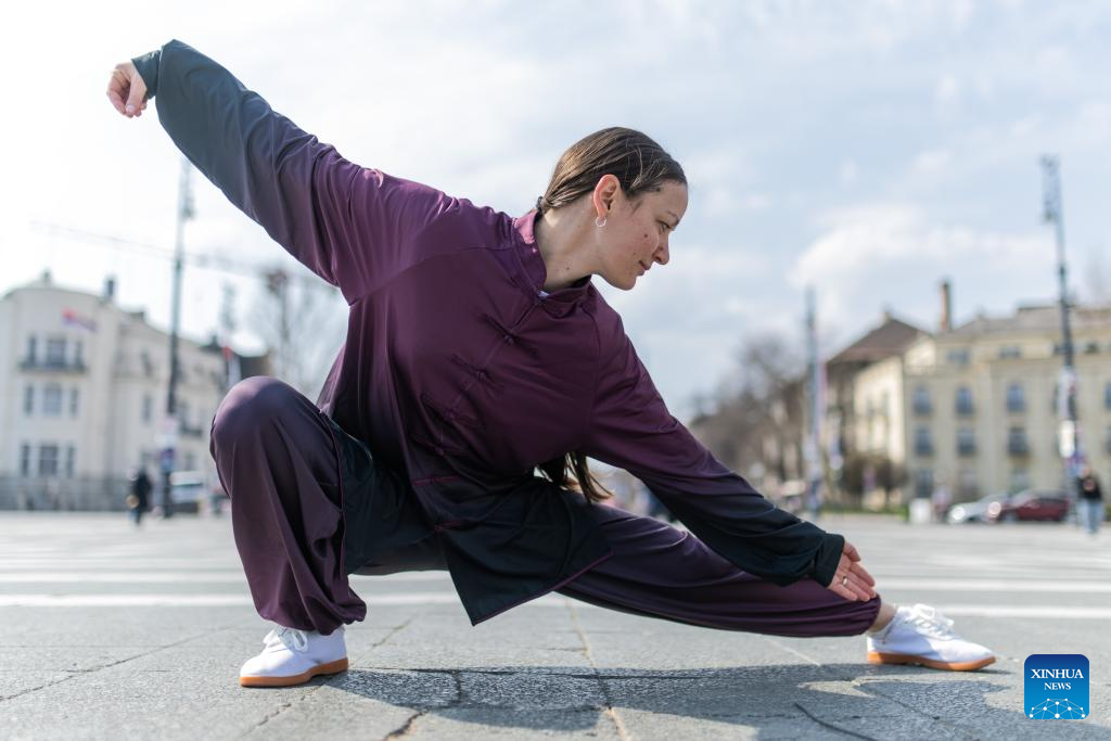 Alexandra Rudolf, a Taijiquan enthusiast, poses for a photo during the celebration event in Budapest, Hungary, on March 21, 2026. A celebration of the first International Day of Taijiquan, organized by the Hungarian Wushu Federation, was held here on Saturday at Heroes' Square. (Photo by Marton Koncz/Xinhua)
