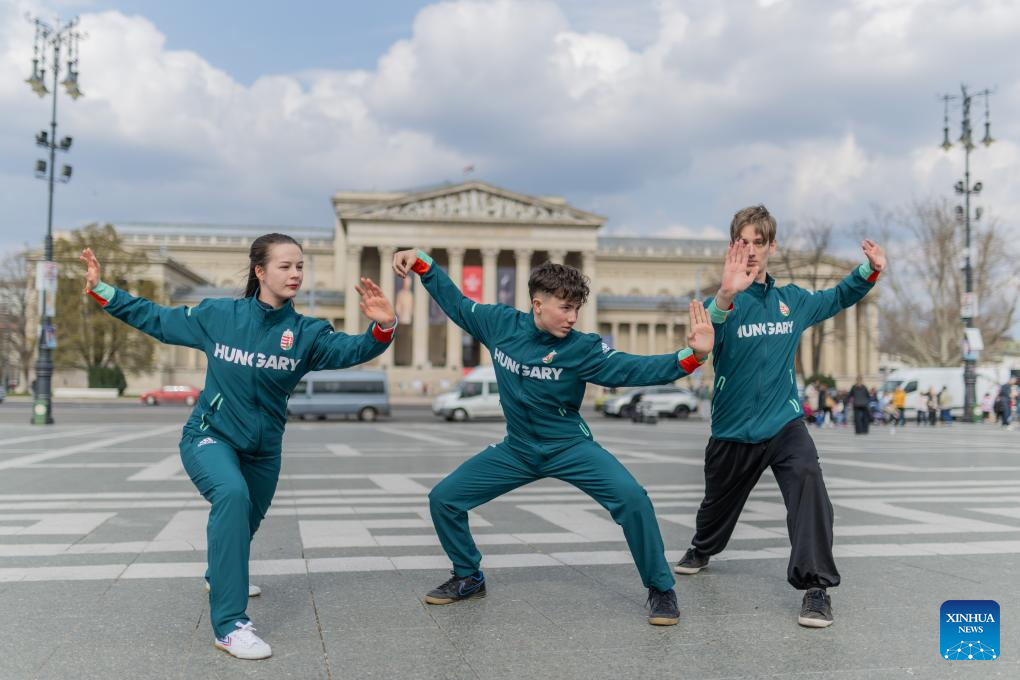 Barnabas Balogh (R), a coach of the Hungarian Wushu Team, and Konrad Vereb (C), an athlete of the Hungarian Wushu Team, pose for a photo during the celebration event in Budapest, Hungary, on March 21, 2026. A celebration of the first International Day of Taijiquan, organized by the Hungarian Wushu Federation, was held here on Saturday at Heroes' Square. (Photo by Marton Koncz/Xinhua)