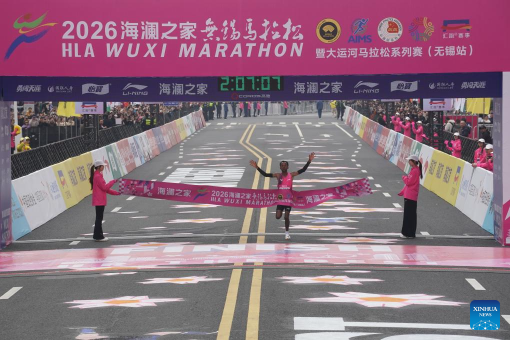 Amid Fozya Jemal of Ethiopia crosses the finishing line during the Wuxi Marathon 2026 in Wuxi, east China's Jiangsu Province, March 22, 2026. (Photo by Liu Zhenrui/Xinhua)
