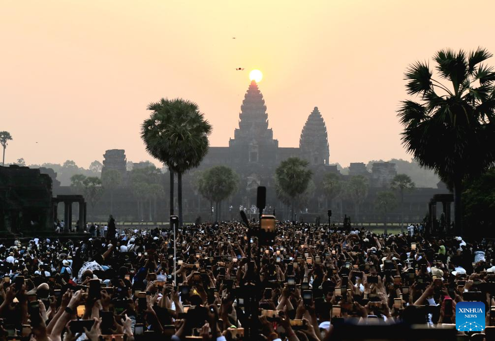 Tourists gather to watch the sunrise at the Angkor Wat temple in Siem Reap province, Cambodia on March 22, 2026. (Photo by Sao Khuth/Xinhua)
