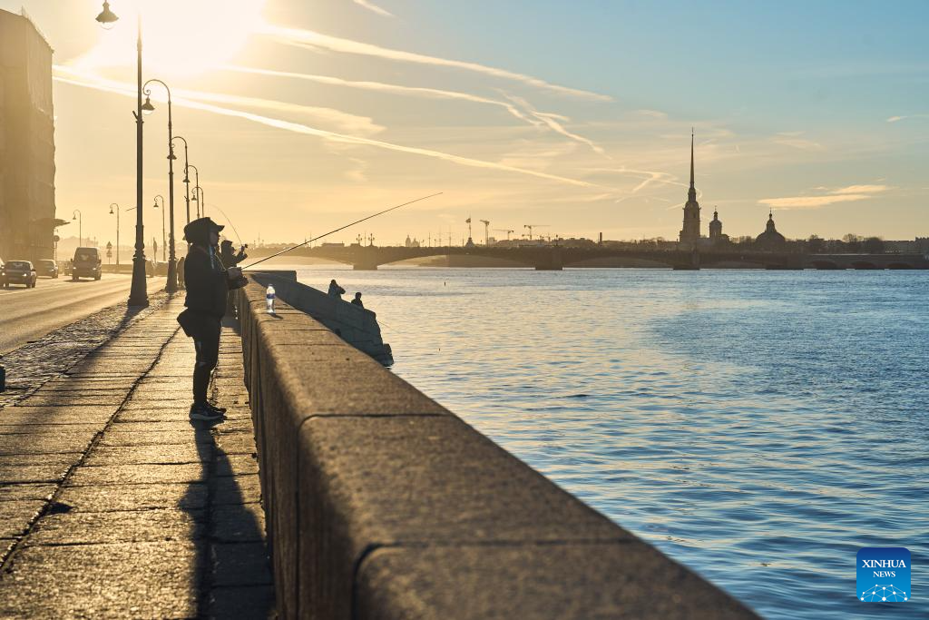 People fish by the Neva River at sunset in St. Petersburg, Russia on March 21, 2026. (Photo by Guo Feizhou/Xinhua)