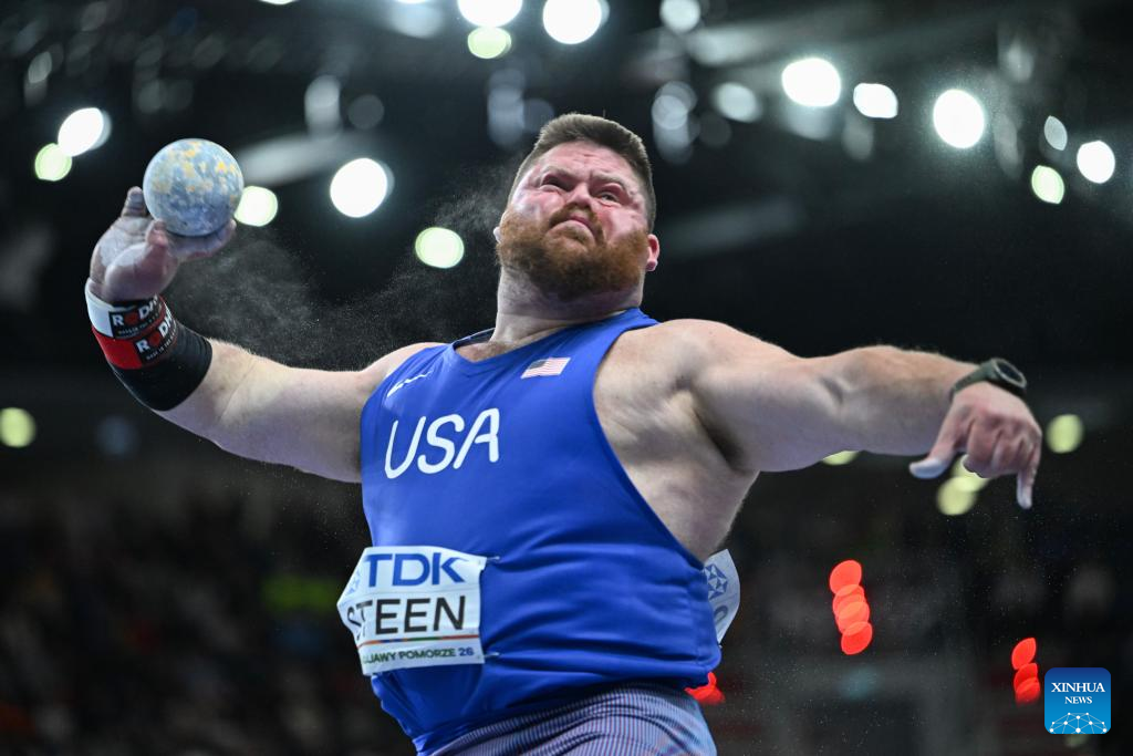 Roger Steen of the United States competes during the men's shot put final at the 2026 World Athletics Indoor Championships in Torun, Poland, March 22, 2026. (Xinhua/Zhang Haofu)